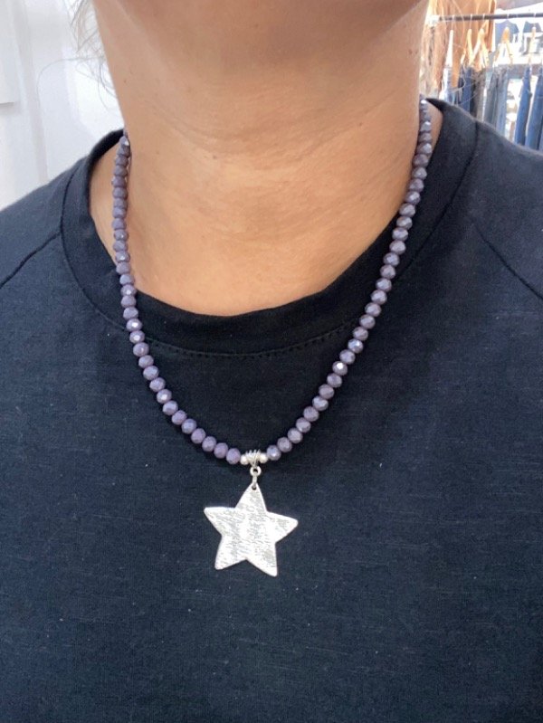 Collar realizado en cristal de roca de 6mm, 45cm de largo, más cadena alargadora de 5cm de acero quirúrgico . Dije de fundición.